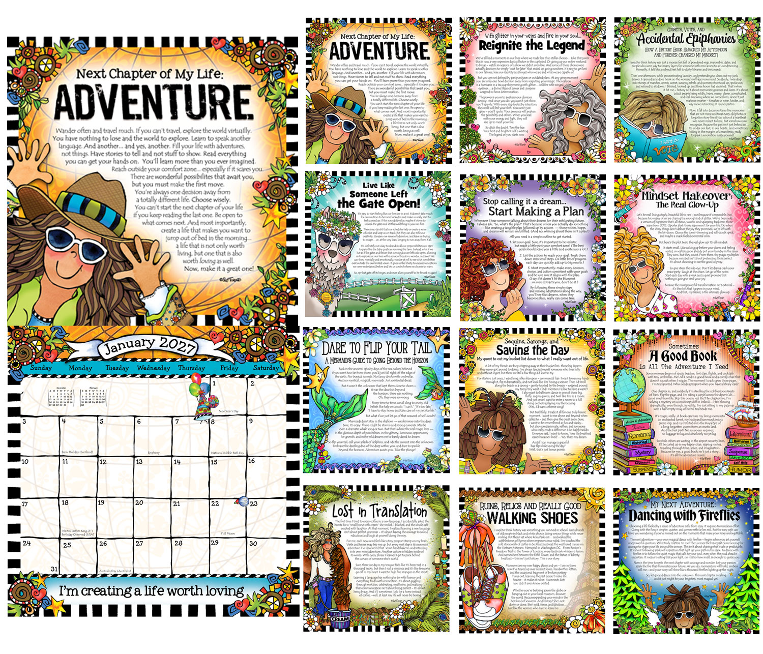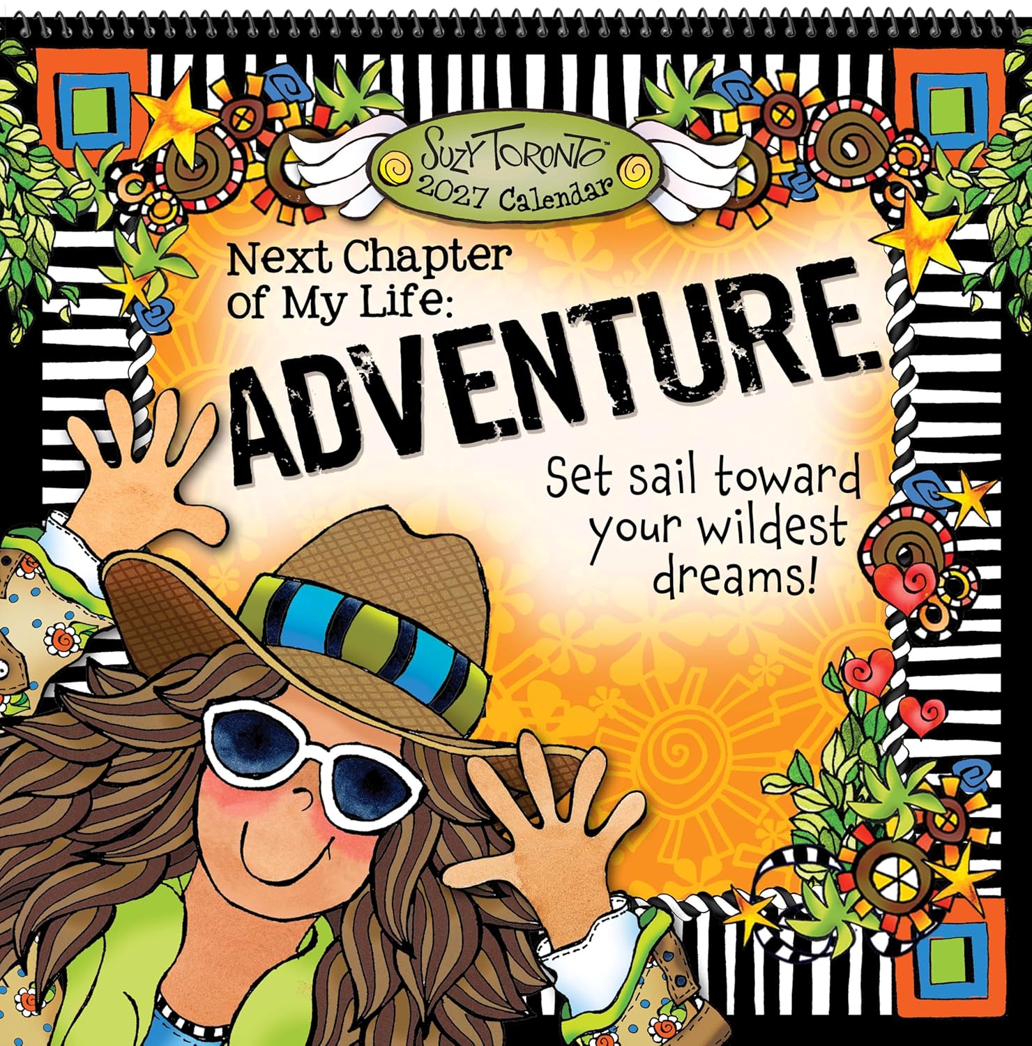 The Suzy Toronto Next Chapter of My Life: ADVENTURE 2027 Wall Calendar is a 12-month standard calendar that features vibrant, colorful artwork, whimsical illustrations, and inspirational scenes. Each month highlights activities such as pursuing dreams, living boldly and joyfully, embracing unique paths, and celebrating adventure and positivity. The calendar includes empowering messages paired with Suzy Toronto’s signature whimsical artwork, providing motivational quotes and inspirational text that encourage personal growth and positive living throughout the year. This wall calendar measures 12″ x 12″ when closed and 12″ x 24″ when open, starting on 1/1/2027. It features a large grid size for easy scheduling and includes major U.S. and international holidays for reference. The calendar is designed for wall placement and uses a spiral binding for easy page turning. Constructed with high-quality textured paper, the calendar is bound with both spiral and stapled binding for durability. The wall format allows for convenient reference and display of Suzy Toronto’s artwork and messages throughout the 12-month period. This calendar serves as an organizational tool and a reference for important dates during the year.