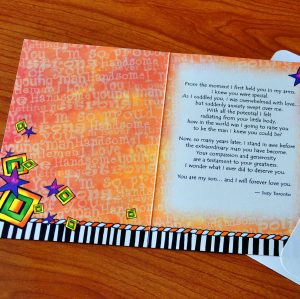 Heartfelt sentiment: author/illustrator Suzy Toronto’s heart-tingling words and fun-filled illustrations are perfect for letting your son know how much he means to you every day; see photo for greeting card message