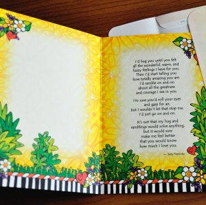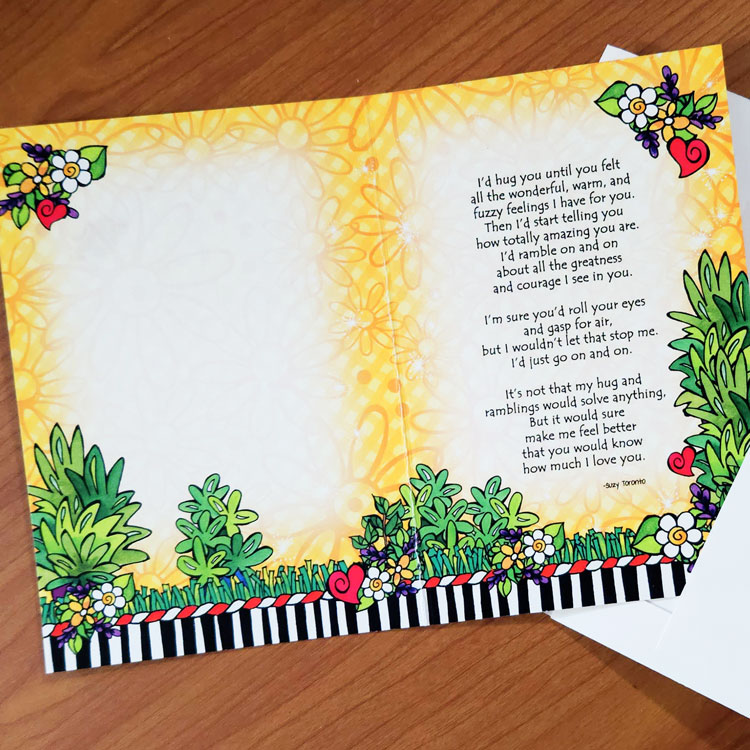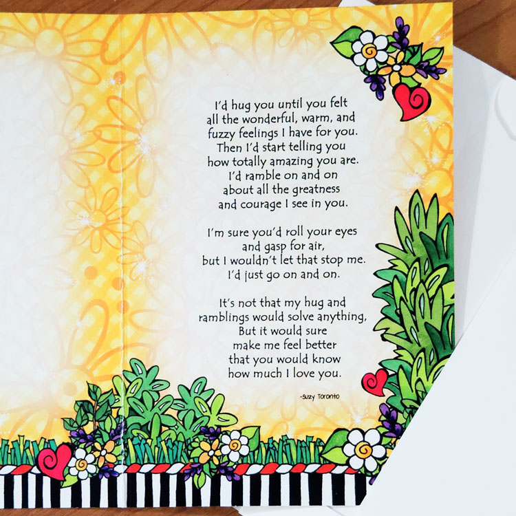 Heartfelt sentiment: author/illustrator Suzy Toronto’s heart-tingling words and fun-filled illustrations are perfect for letting someone special in your life know how much they mean to you every day; see photo for greeting card message