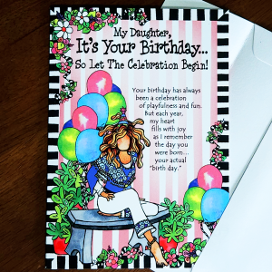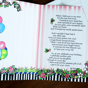 Heartfelt sentiment: author/illustrator Suzy Toronto’s heart-tingling words and fun-filled illustrations are perfect for letting your daughter know how much she means to you on her birthday and every day; see photo for greeting card message