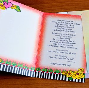 Heartfelt sentiment: author/illustrator Suzy Toronto’s heart-tingling words and fun-filled illustrations are perfect for letting your mother know how much she means to you this Mother’s Day; see photo for greeting card message