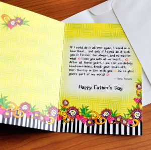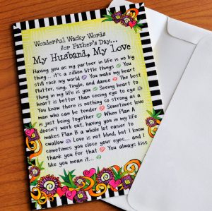Heartfelt sentiment: author/illustrator Suzy Toronto’s heart-tingling words and fun-filled illustrations are perfect for letting your husband know how much he means to you on Father’s Day and every day; see photo for greeting card message